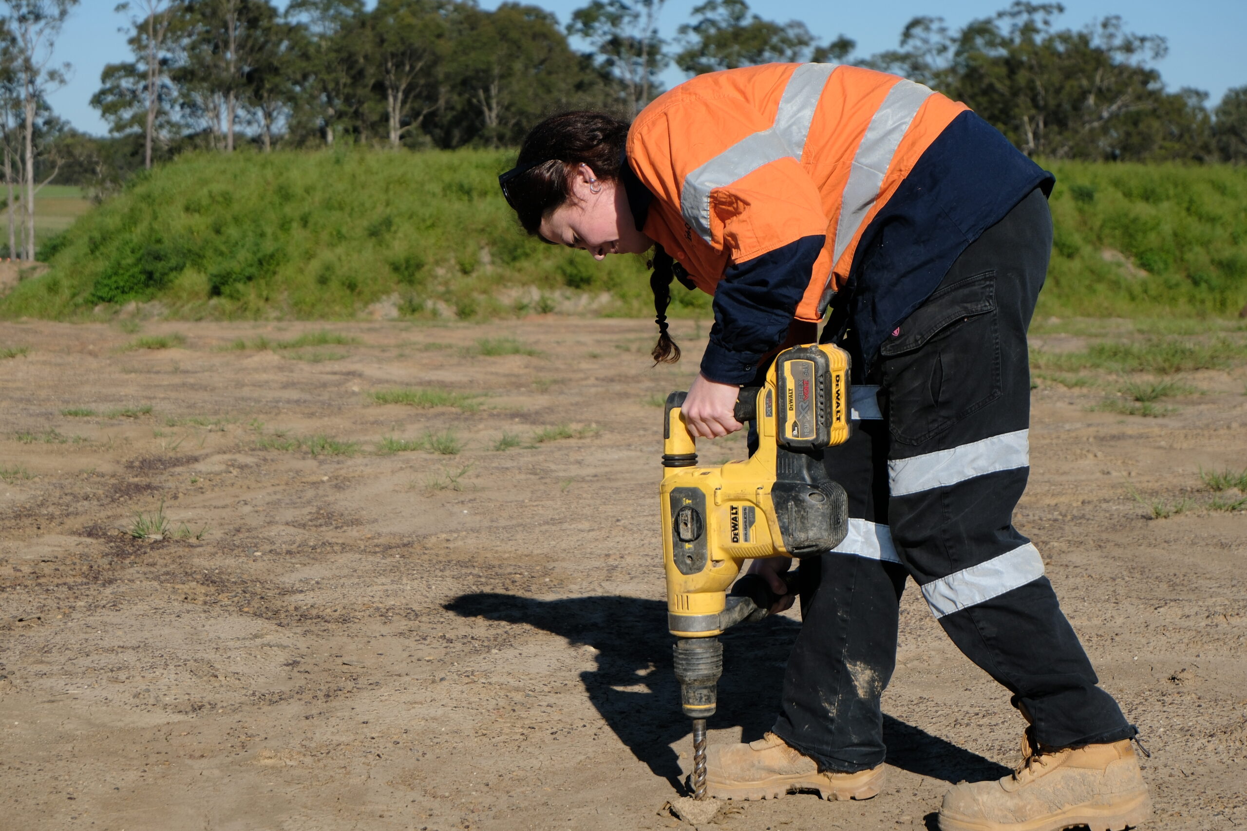 IdealCorp technician Sam arrives on site and begins systematic compaction testing across the fill areas. Using a rotary hammer drill, sample holes are prepared at designated test locations across the bulk earthworks footprint. Each test measures the density and moisture content of the compacted fill, determining whether the layer meets the required compaction standard.
