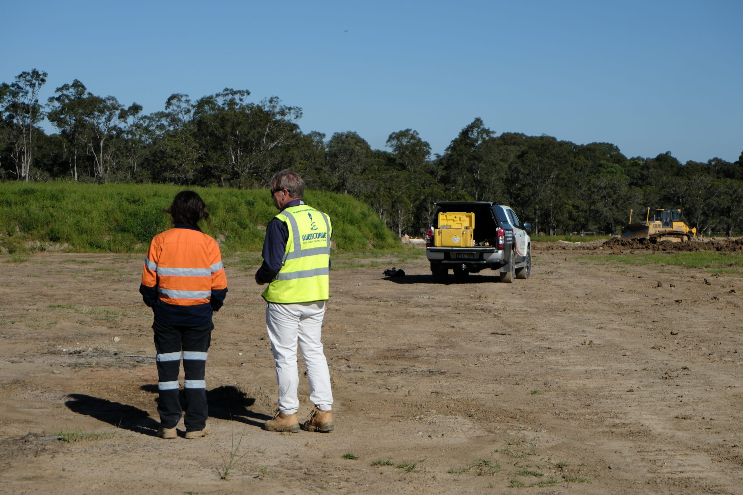 You see two professionals standing on an open bulk earthworks site, surveying the work in progress — an excavator moving in the background, fill stretching across what will become a residential development. You see a team that arrives prepared, assesses the full picture, and communicates clearly with everyone on site.